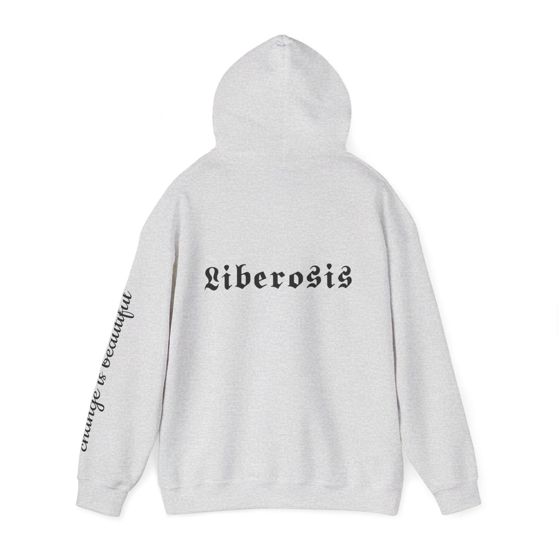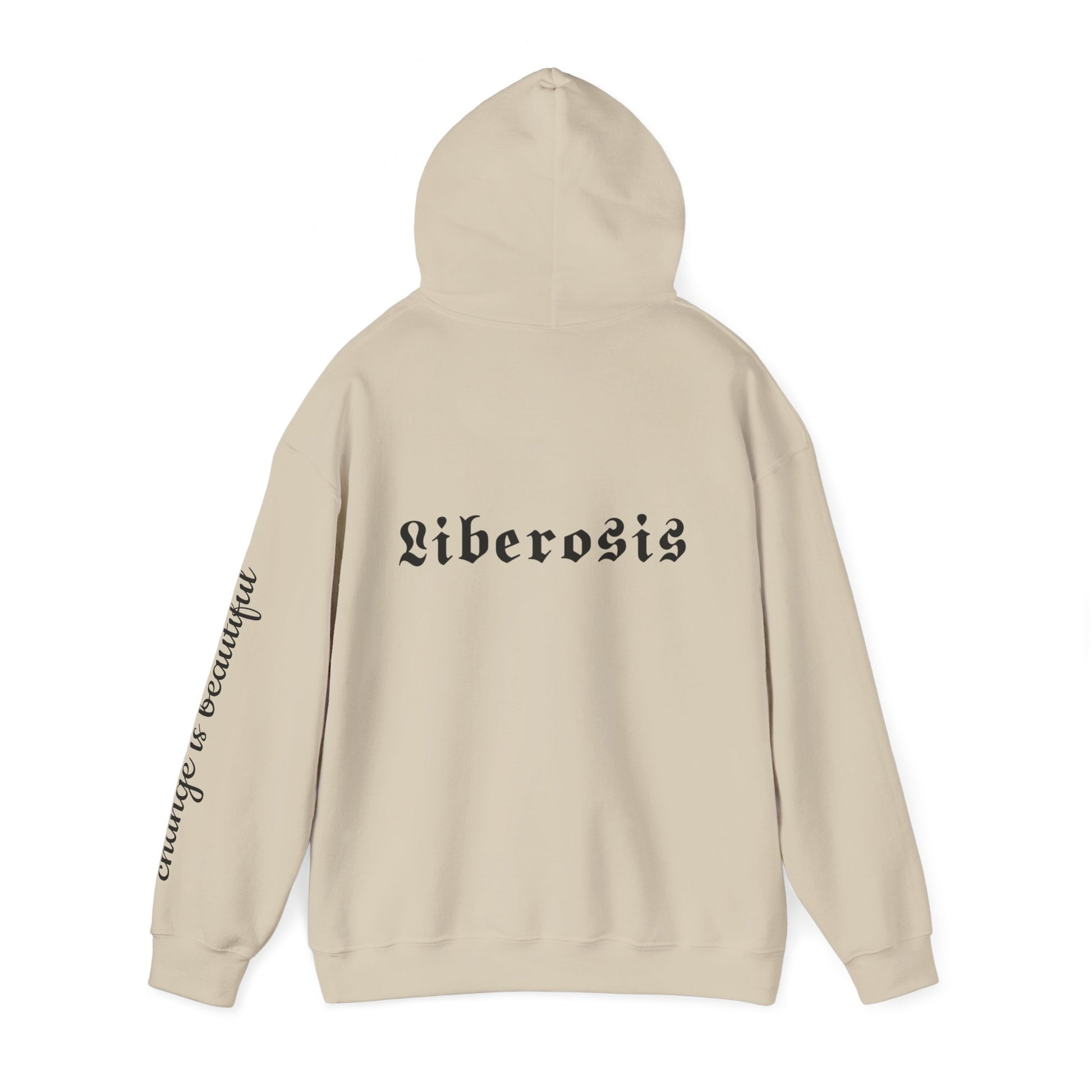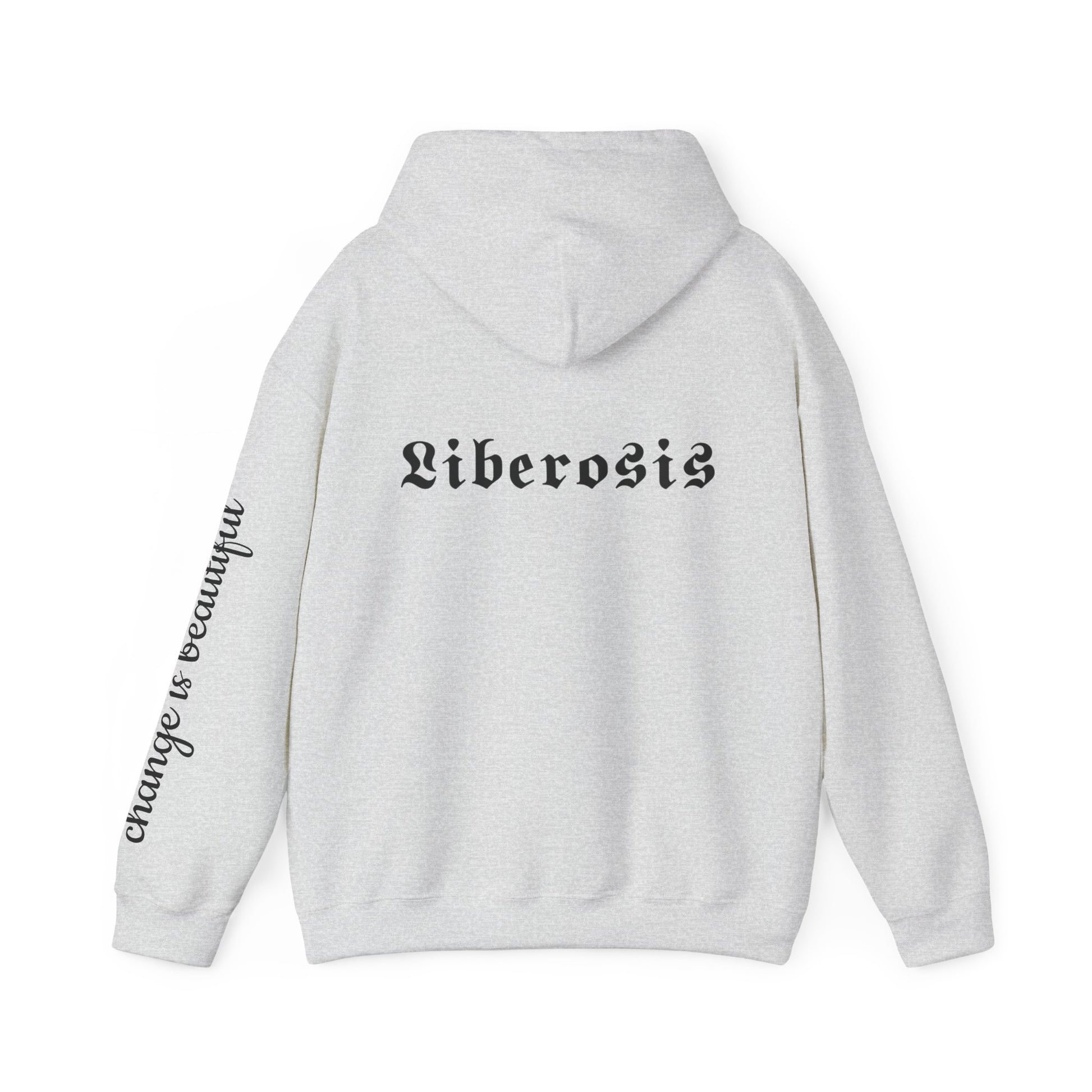 This hoodie features the phrase 'Change is beautiful' on the arms and the store name 'liberosis' on the back, inspiring change in a stylish way. It is perfect for those looking for a cozy and warm hoodie with a meaningful message. Suitable for adults and ideal for casual wear.